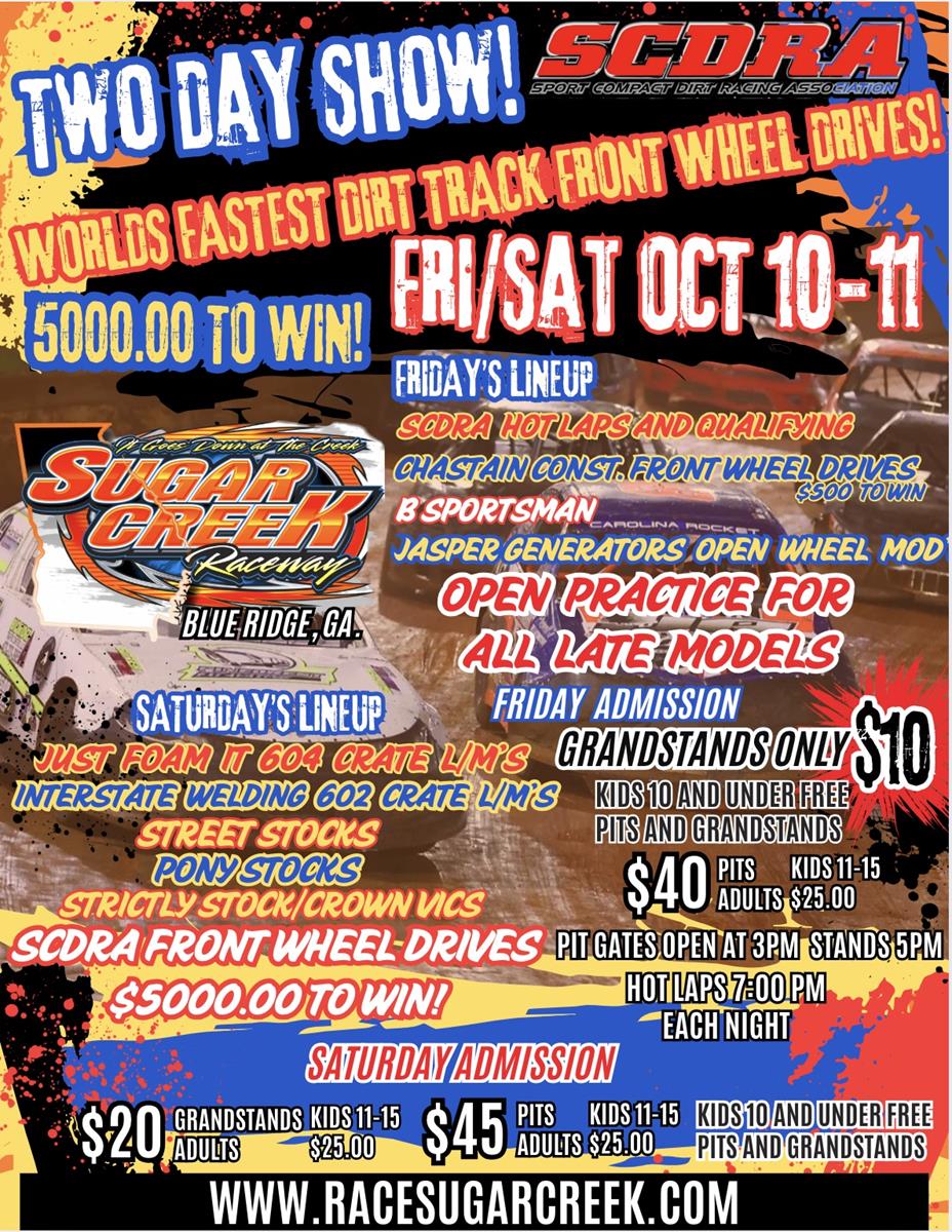Sporting the worlds fastest dirt track front wheel drives, The Sport Compact Dirt Racing Association (SCDRA) invades Sugar Creek Raceway for the first time ever!